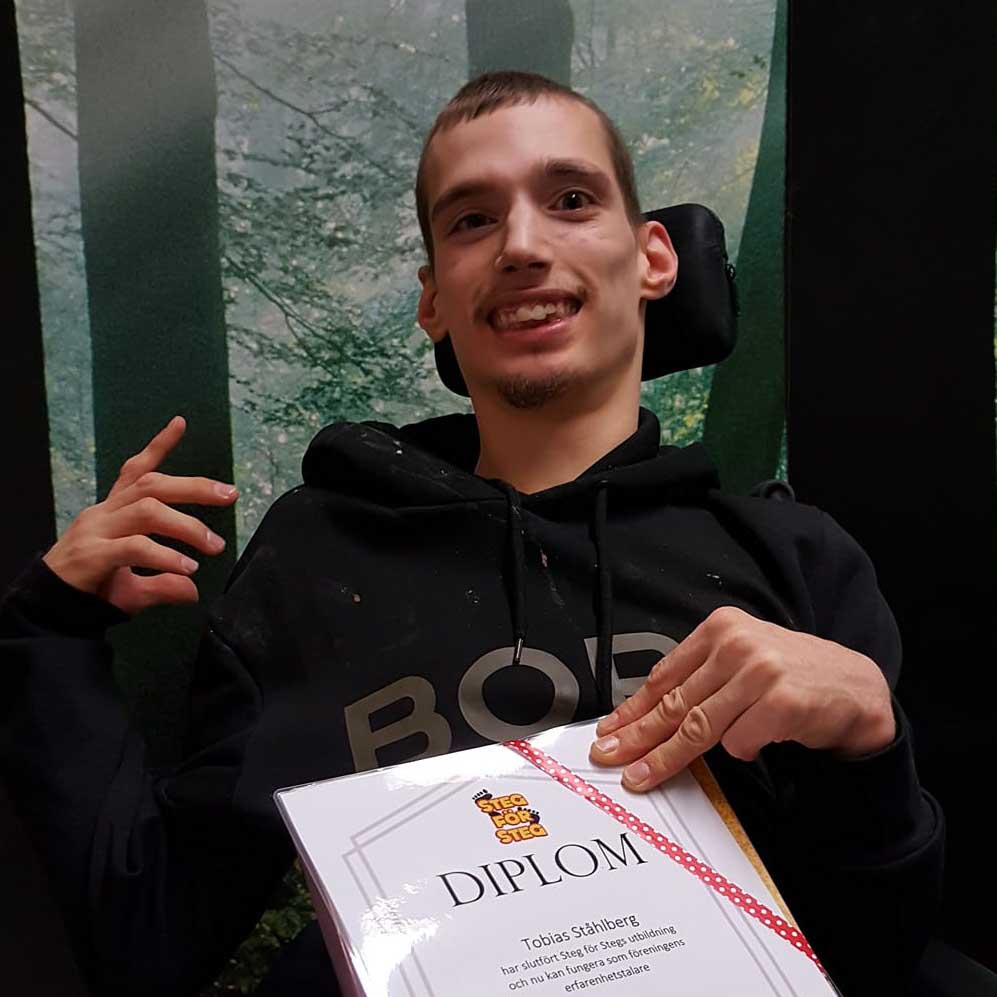 Använder sig av AKK, alternativ och kompletterande kommunikation, och kan berätta om hur det är att inte ha ett talat språk.