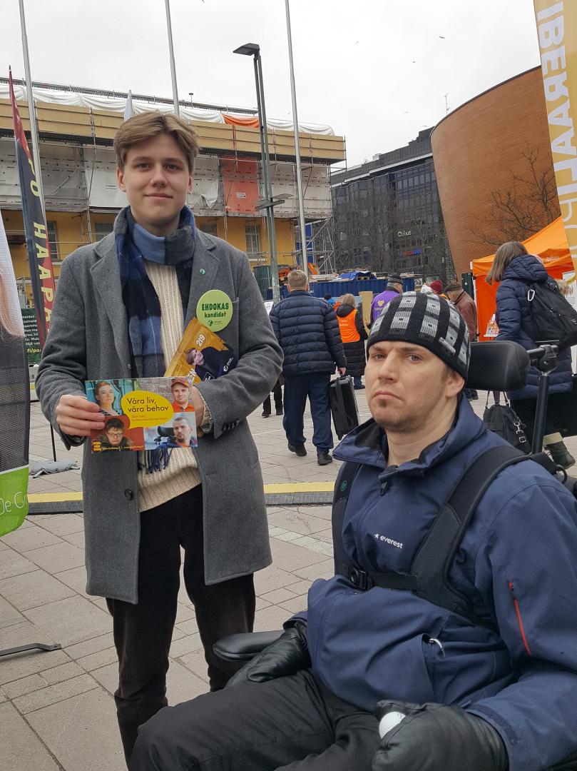 Kaapo Haapanen (Gröna) stöder vår kampanj om att inte skära ner i funktionshinderservicen. Med på bilden är även Jonas Bergholm från Steg för Steg.