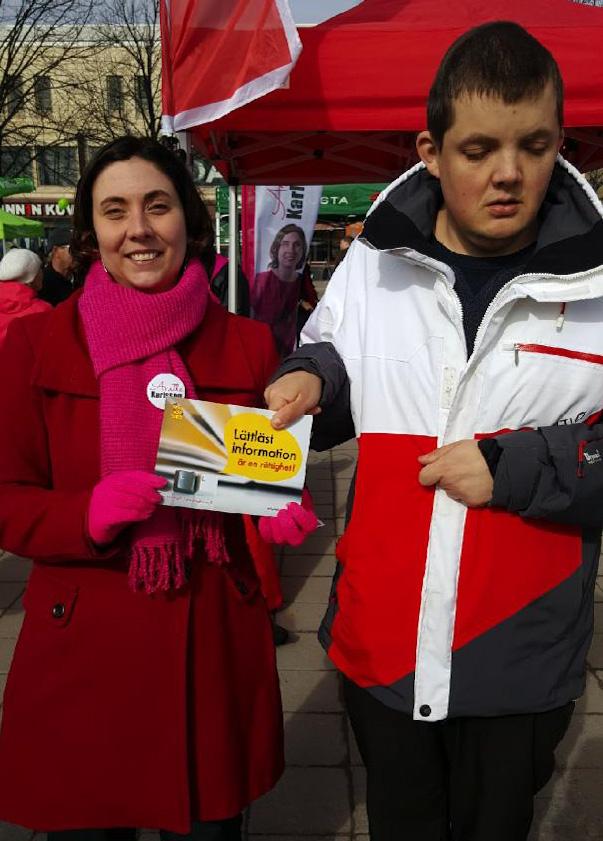 Anette Karlsson (SDP) stöder vår kampanj om lättläst. Med på bilden är även Johan Lustig från Steg för Steg.