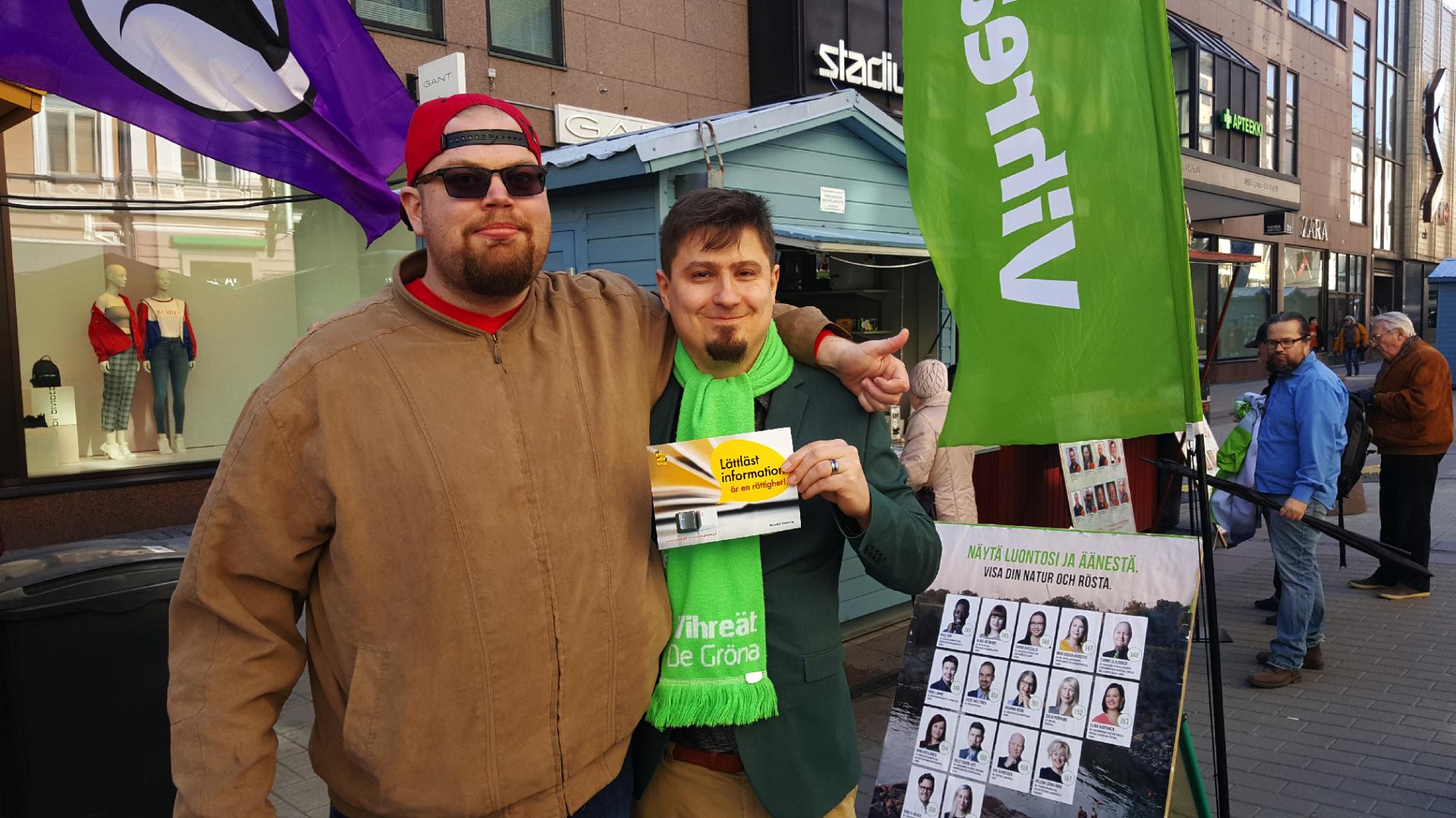 Ville Savonlahti (gröna) stöder vår kampanj om att rätten till lättläst information ska skrivas in i lagen. Med på bilden är även Tero Määttä från Steg för Steg.