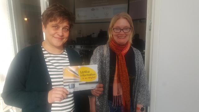 Riksdagsledamot Silvia Modig (VF) stöder vår kampanj om att rätten till lättläst information ska skrivas in i lage. Med på bilden är även Daniela Frankenhaeuser från Steg för Steg.Läs mera »