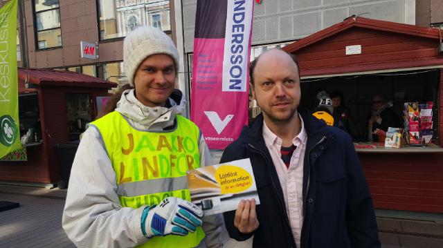 Jaakko Lindfors (VF) stöder vår kampanj om att rätten till lättläst information ska skrivas in i lagen. Med på bilden är även Anders Ranta-aho från Steg för Steg.Läs mera »