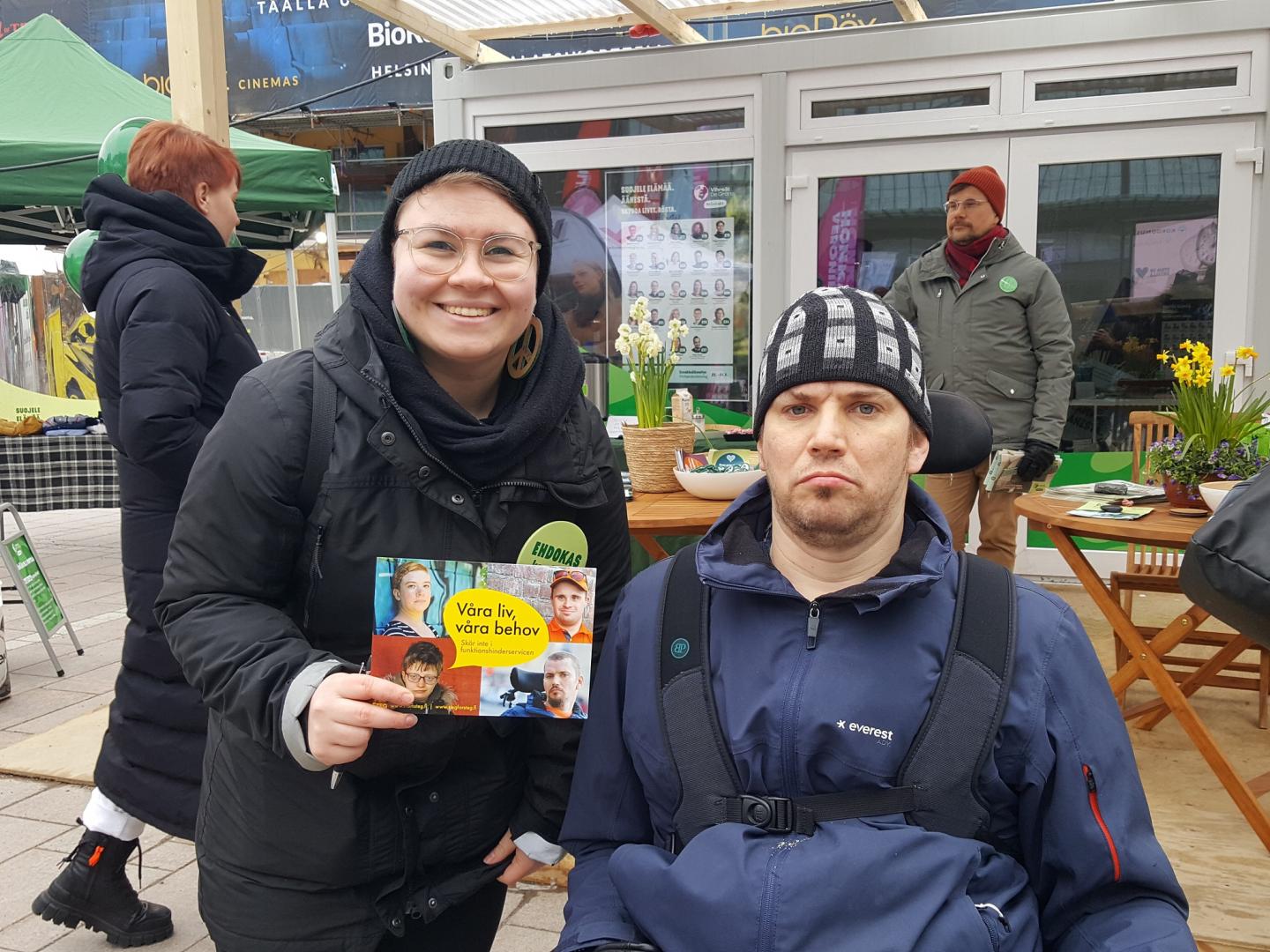 Bicca Olin (Gröna) stöder vår kampanj om att inte skära ner i funktionshinderservicen. Med på bilden är även Jonas Bergholm från Steg för Steg.