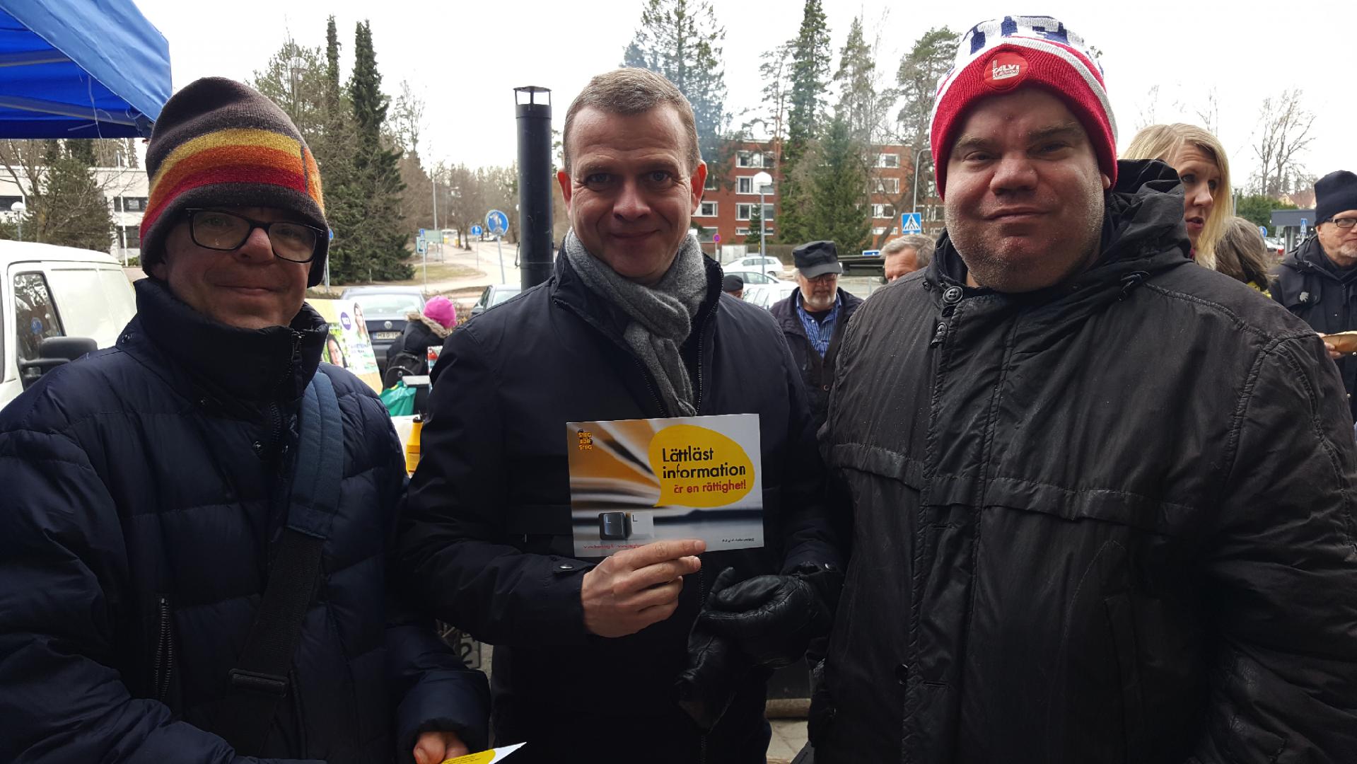 Finansminister Petteri Orpo (Saml) stöder vår kampanj om att rätten till lättläst information ska skrivas in i lagen. Med på bilden är även Jonne Tallberg och Niclas Jansson från Steg för Steg.